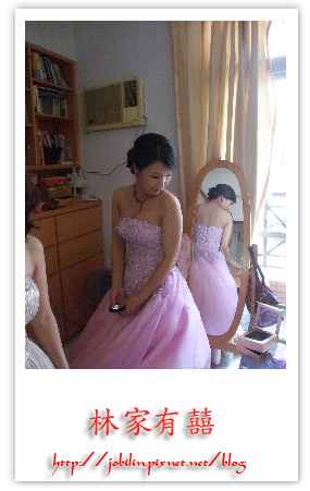 弄好頭髮之後...將前天拿回來的粉紅色禮服...在禮服禮放在裙撐之後...果然比前天單拍婚紗好看多了!