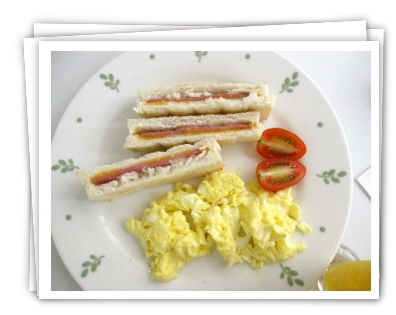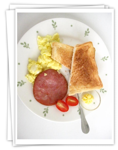 這是涵和如的元氣早餐...一片烤土司配一片火腿和一份炒蛋...!!